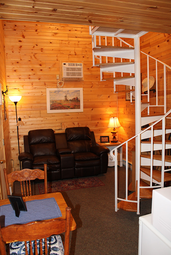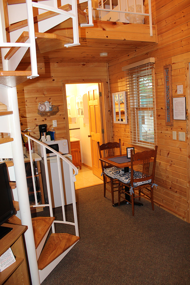 This cozy cottage retreat is perfect for weekend stays! You’ll find your loft bedroom complete with a queen-sized bed at the top of a beautiful spiral staircase. The first floor features a relaxing sitting area, a full private bathroom, and a convenient mini-kitchen. If being on the go is a necessary part of your schedule, then the Scandia Room’s private entrance is perfect for frequent returns and departures without the thought of disturbing others.