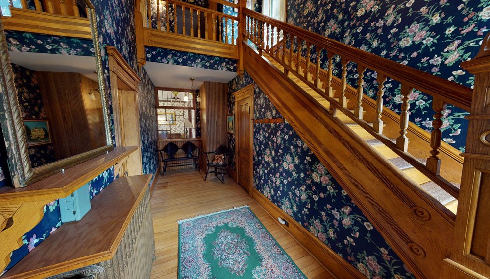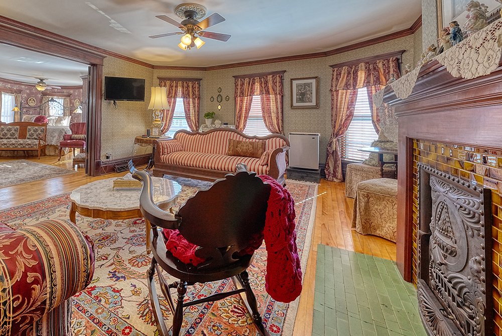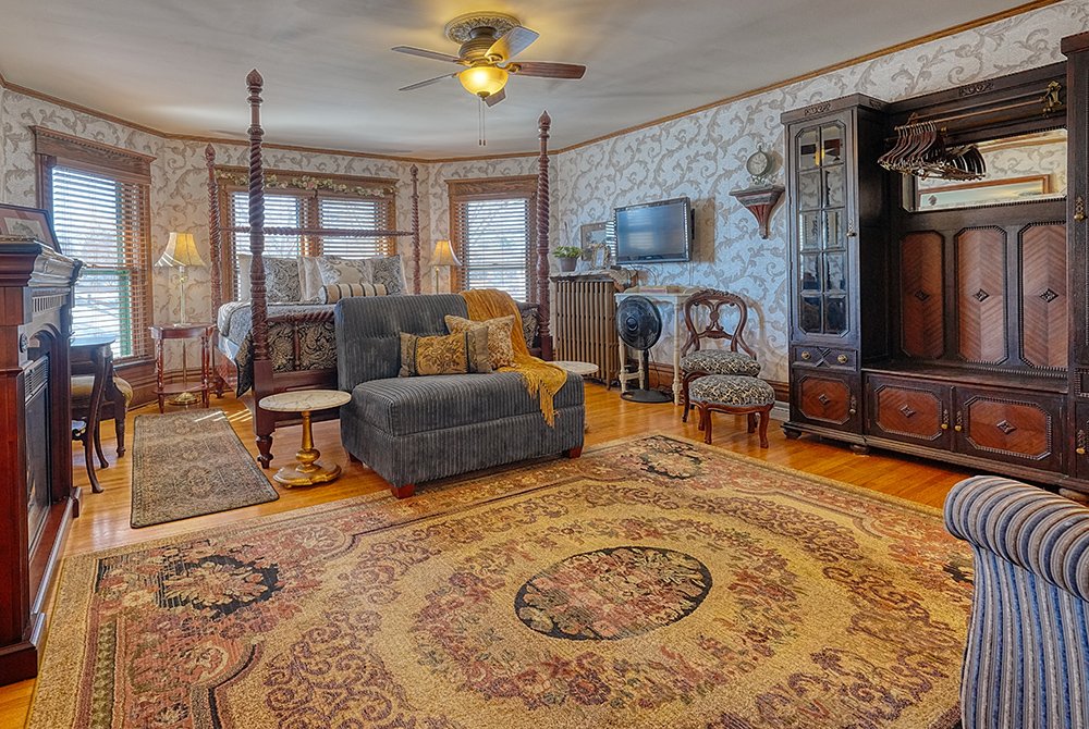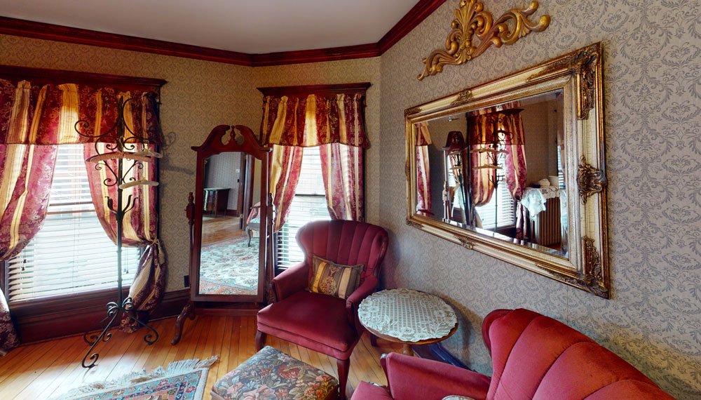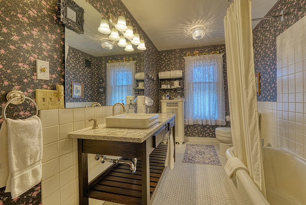 Traditional in its decor, including fine antiques, original woodwork, romantic wallpaper, and an inviting fireplace, our home offers guests a cozy, welcoming atmosphere. We have created plenty of common space, including areas to rest, relax and feel quietly at home. All five elegant private rooms are accessed by the stunning staircase original to the build of the mansion. Every room has cable TV, a private bath, & luxurious linens.