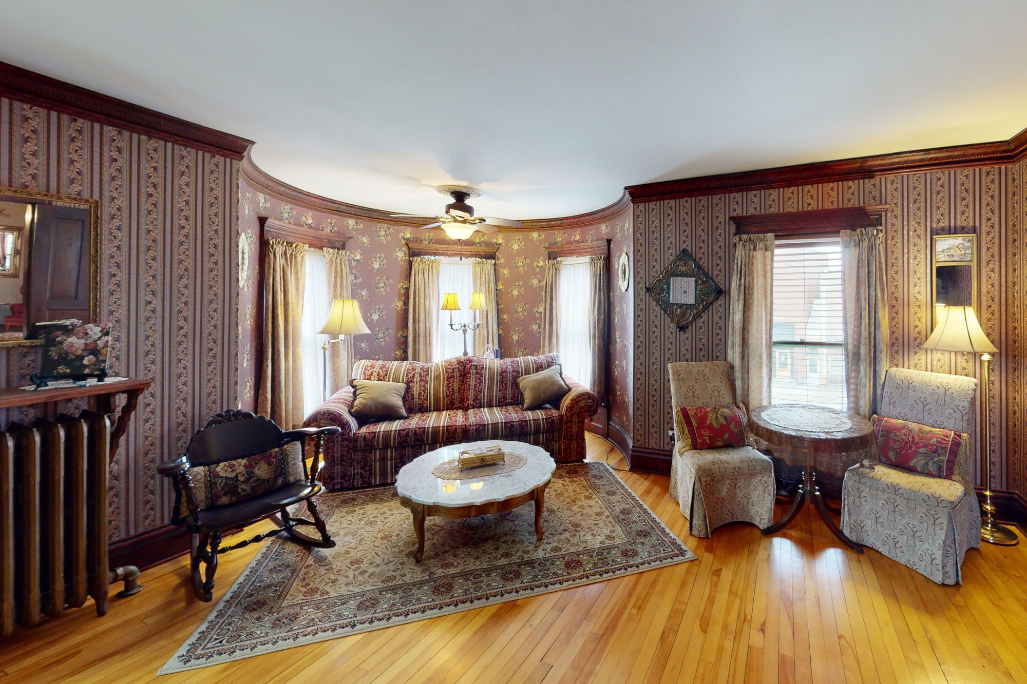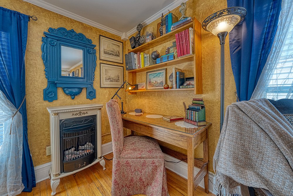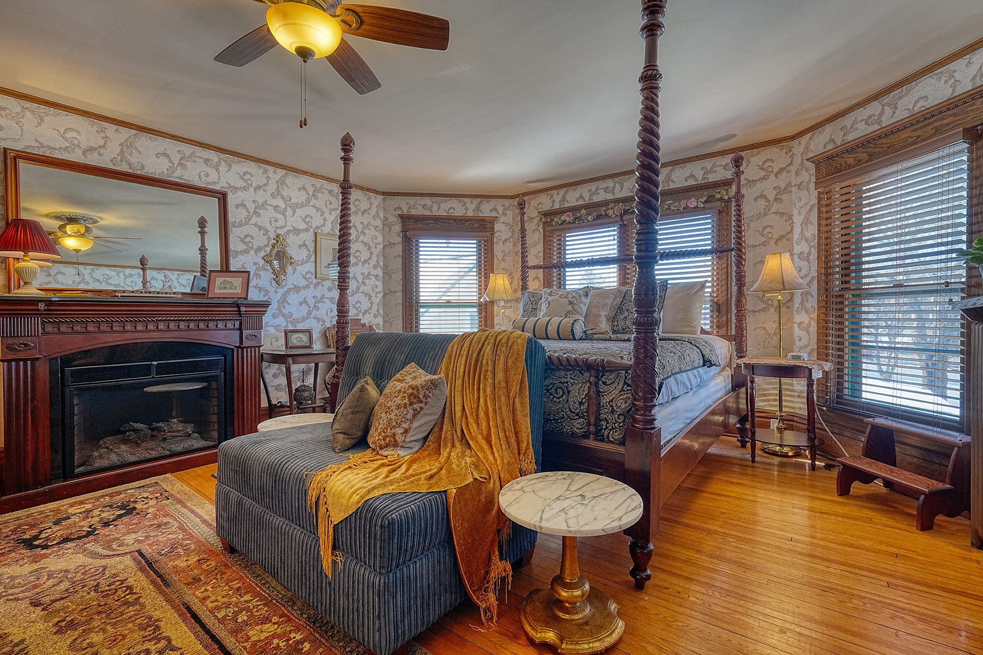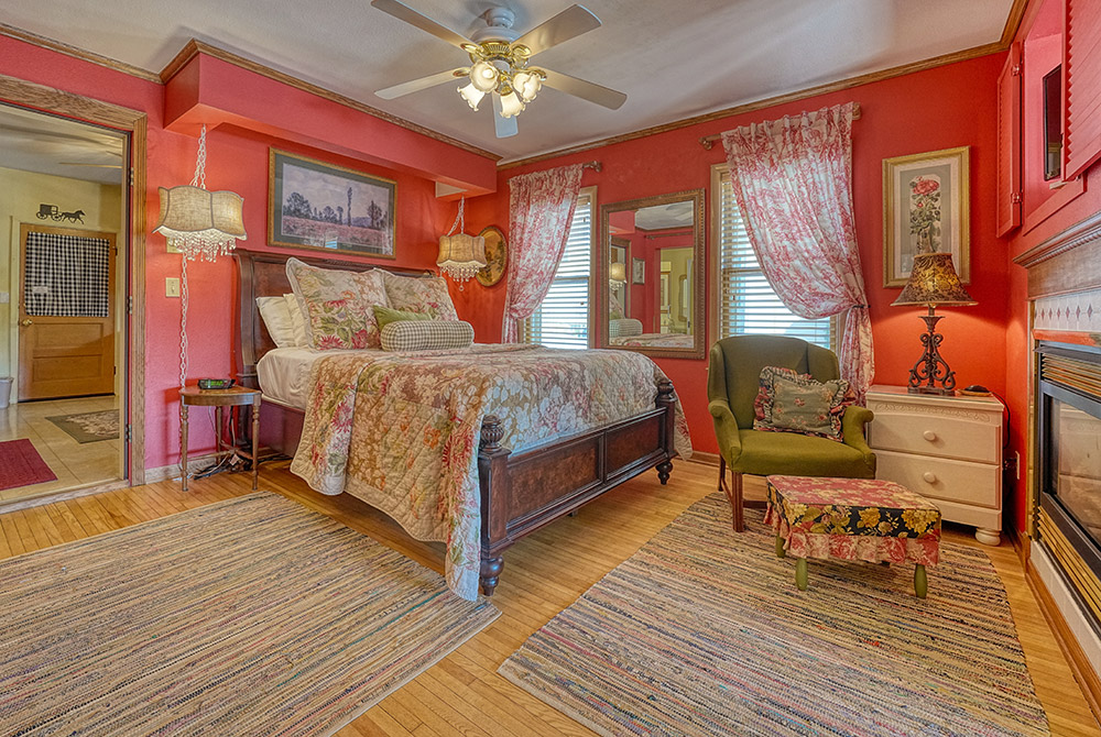 Traditional in its decor, including fine antiques, original woodwork, romantic wallpaper, and an inviting fireplace, our home offers guests a cozy, welcoming atmosphere. We have created plenty of common space, including areas to rest, relax and feel quietly at home. All five elegant private rooms are accessed by the stunning staircase original to the build of the mansion. Every room has cable TV, a private bath, & luxurious linens.
